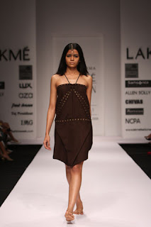 At the Lakme Fashion week 2008, Designer Anuj Sharma presented a stark collection of outfits highlighted by eyelet bordering and close to no sewing with models walking the ramp barefoot. After a long time i have noticed a fashion show with models walking the ramp barefoot. Even in ramp shows showcasing traditional wear, this is not the scene these days so to see models barefeet on a western outfit showcase show is a treat.
